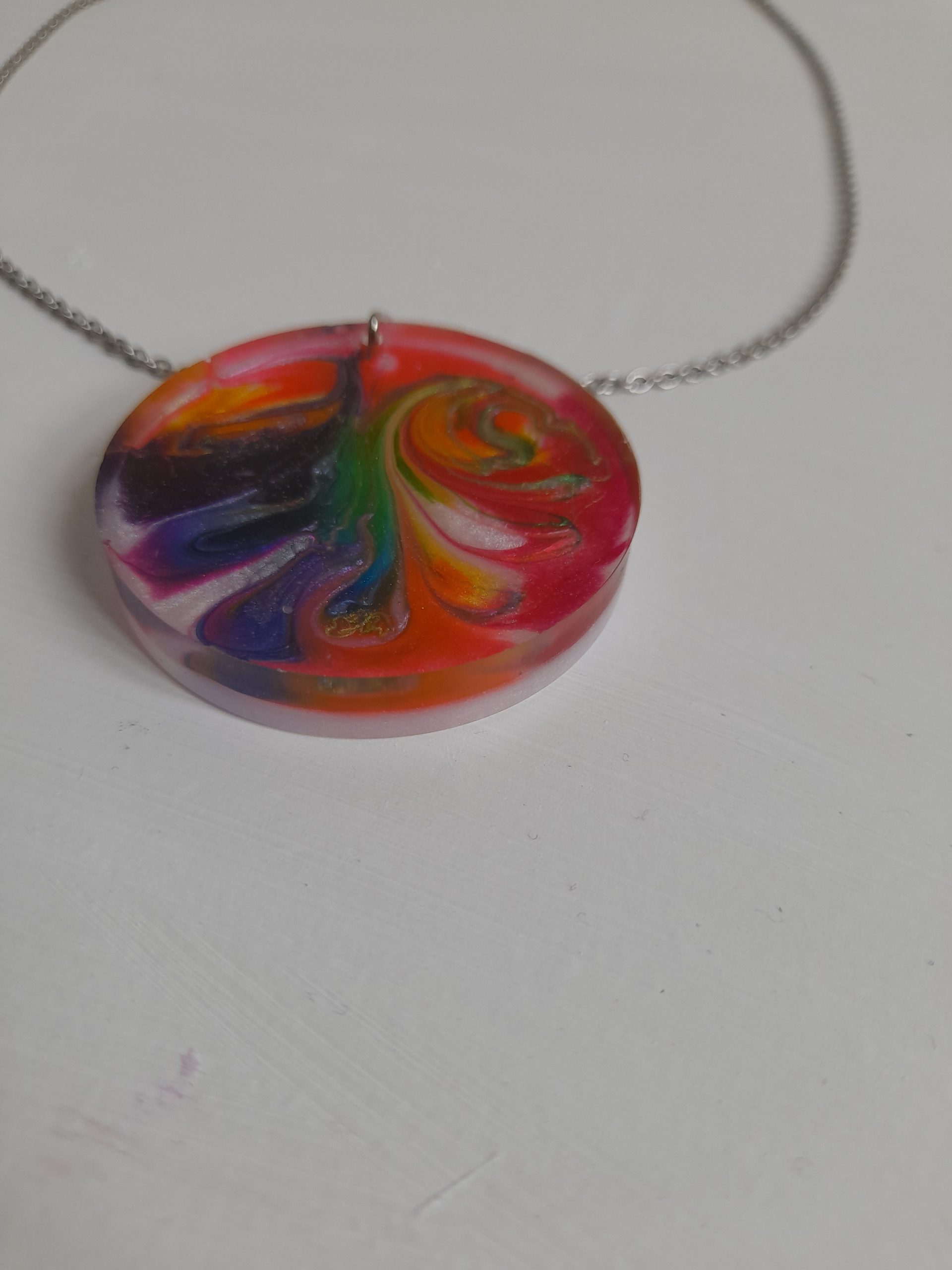 A bold and vibrant stainless steel necklace featuring a large circular resin pendant with a unique multicoloured splash design—perfect for adding a fun, artistic touch to any outfit.