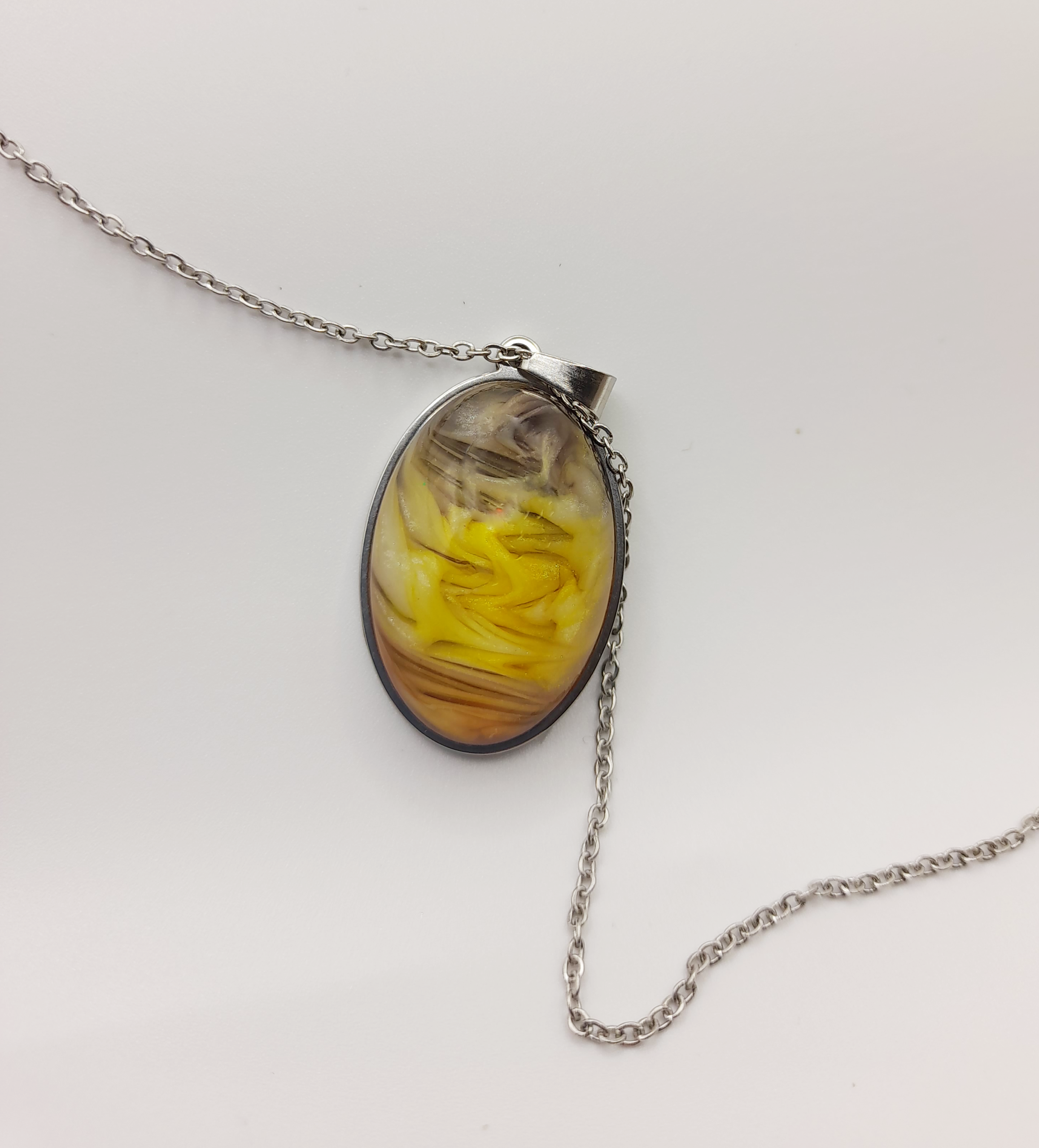 This stainless steel necklace features an oval resin pendant in a striking blend of brown, yellow, and orange hues, creating a warm, fiery effect. The subtle shimmer within the resin catches the light beautifully, giving the pendant depth and movement. Set in a sleek stainless steel plate setting, this piece is both durable and eye-catching, perfect for adding a bold pop of colour to everyday outfits or evening looks.