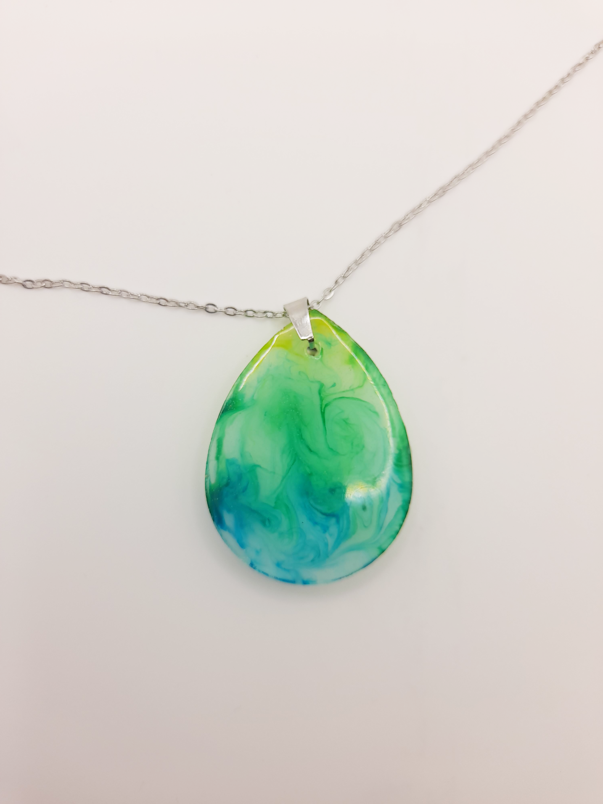 Stainless steel necklace featuring a teardrop resin pendant with flowing green and blue swirled colours for a calm, ocean-inspired look.