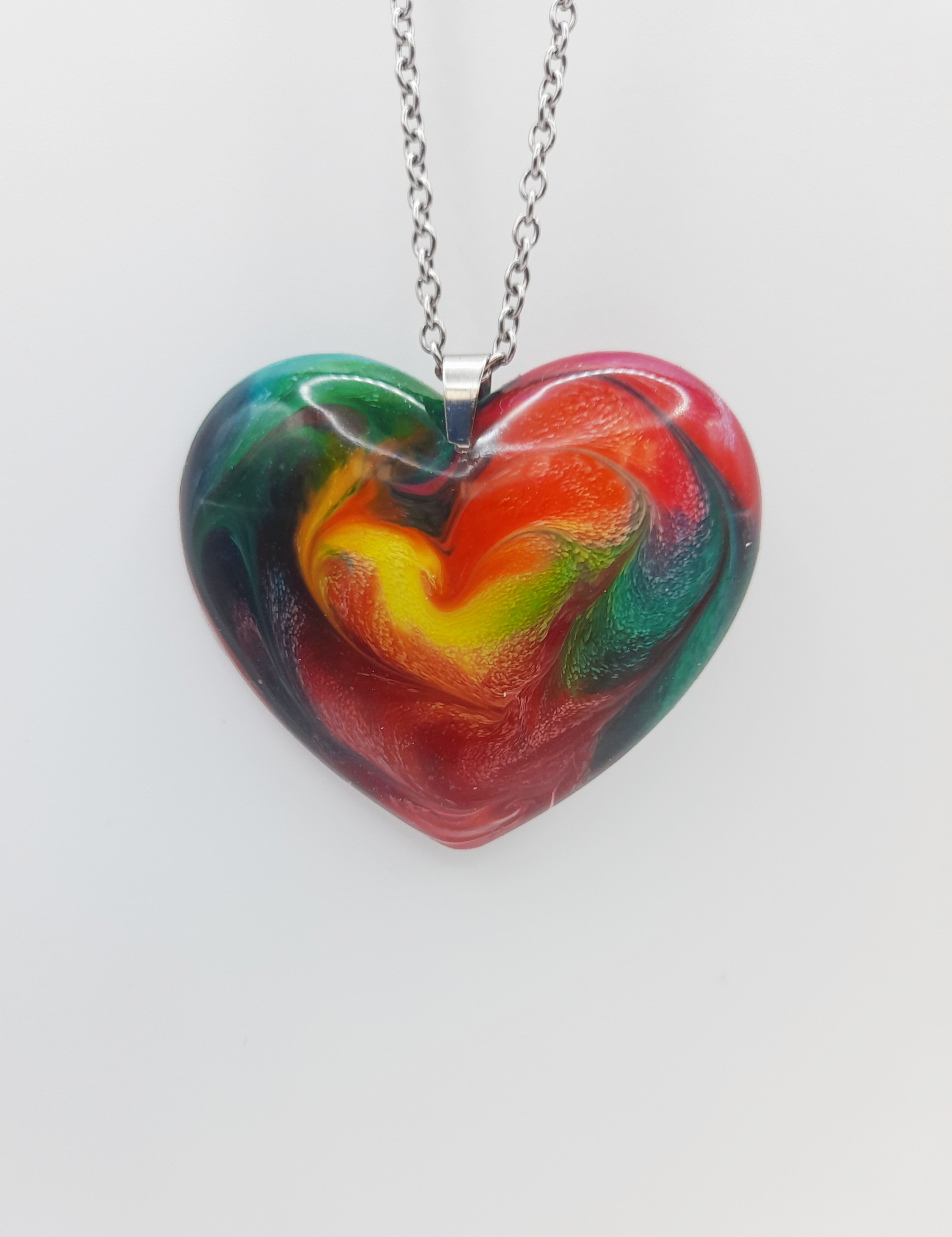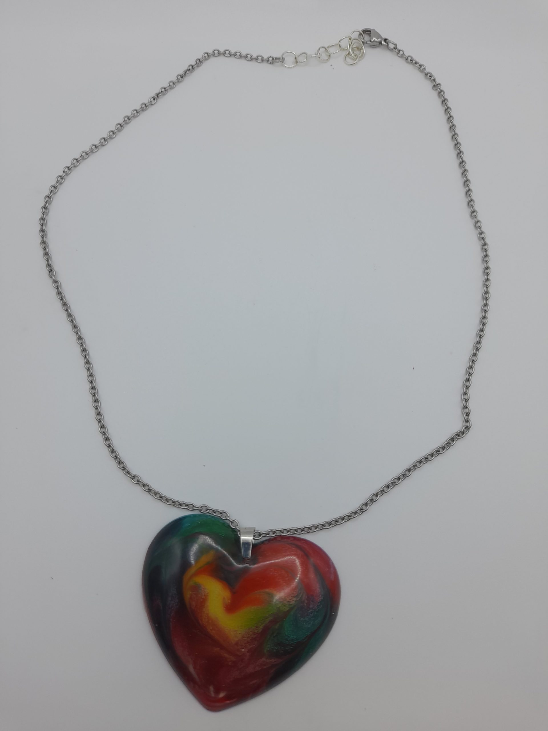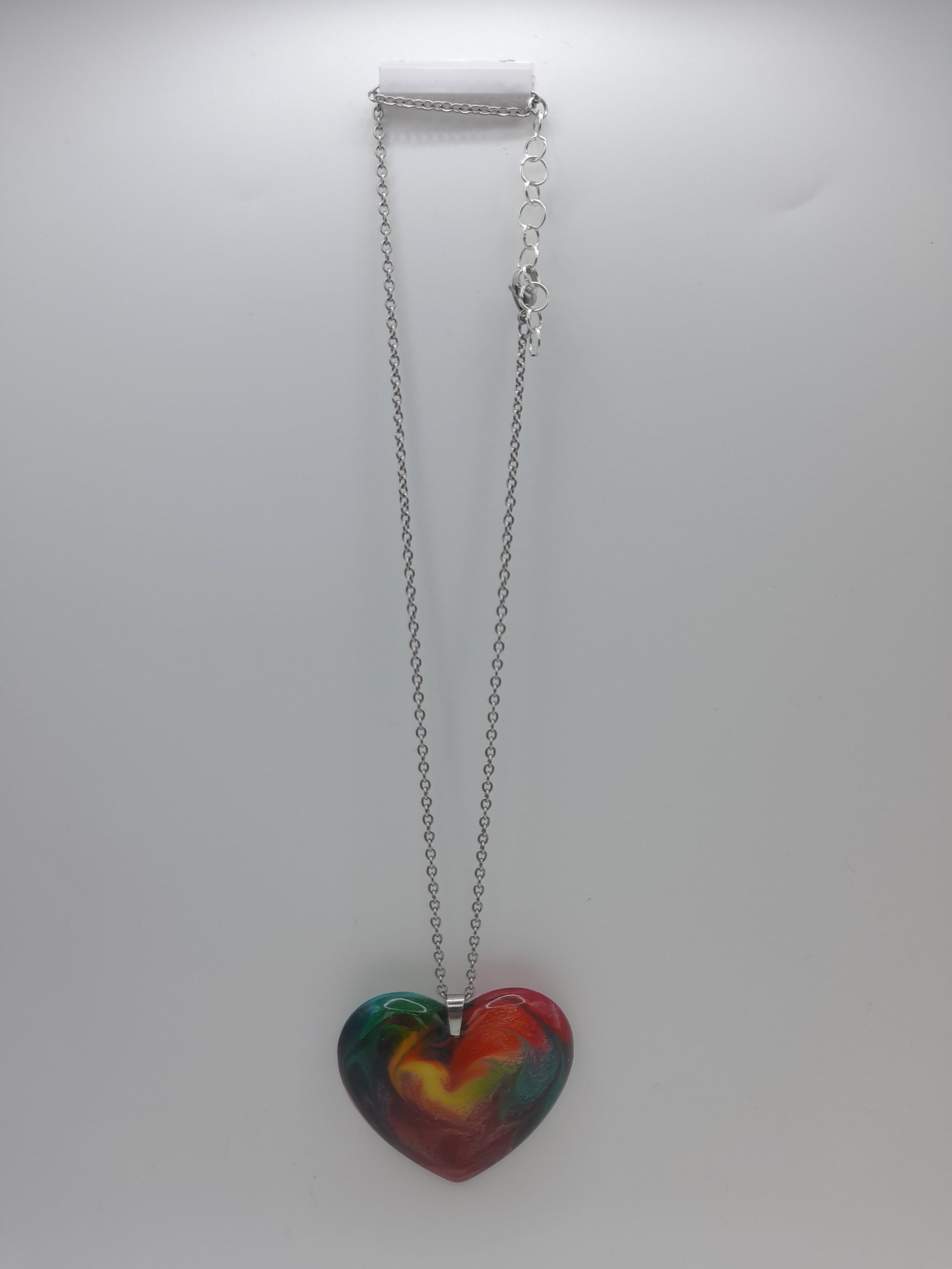 This stainless steel necklace showcases a striking heart-shaped pendant featuring a vivid petri effect in shades of red, green, and yellow. The swirling, organic patterns create a captivating design that stands out beautifully, making it a unique and eye-catching accessory for any jewellery collection.