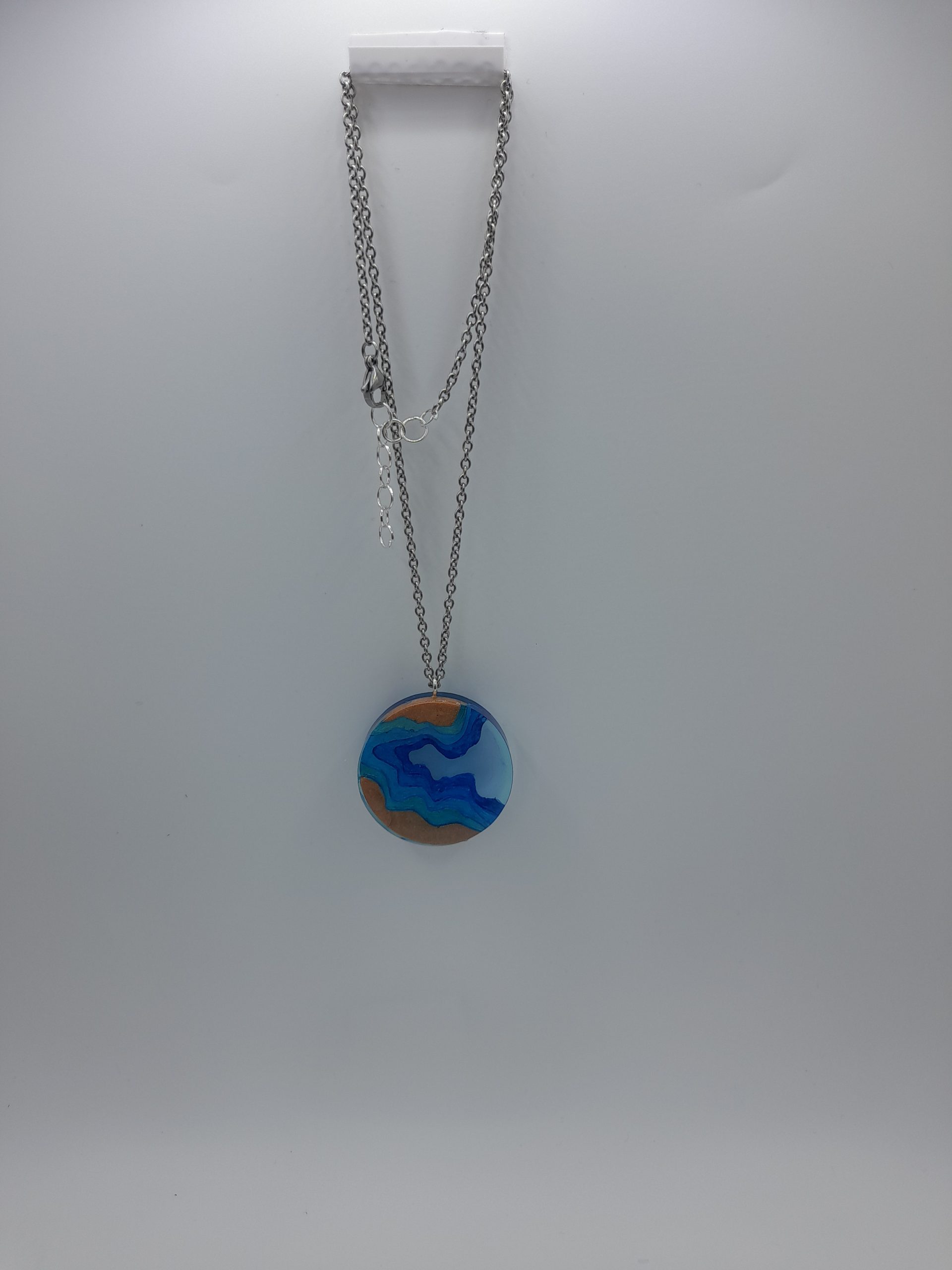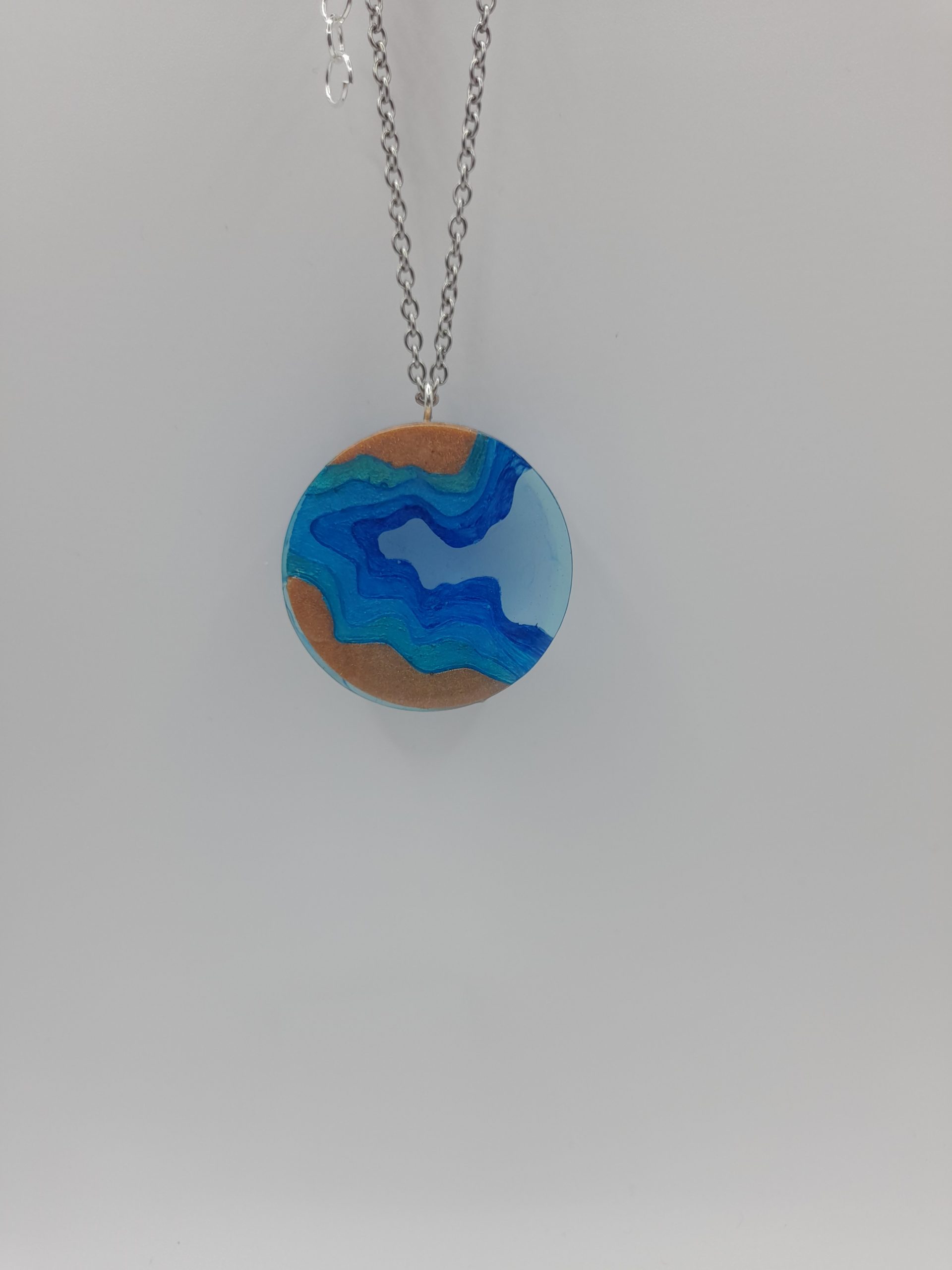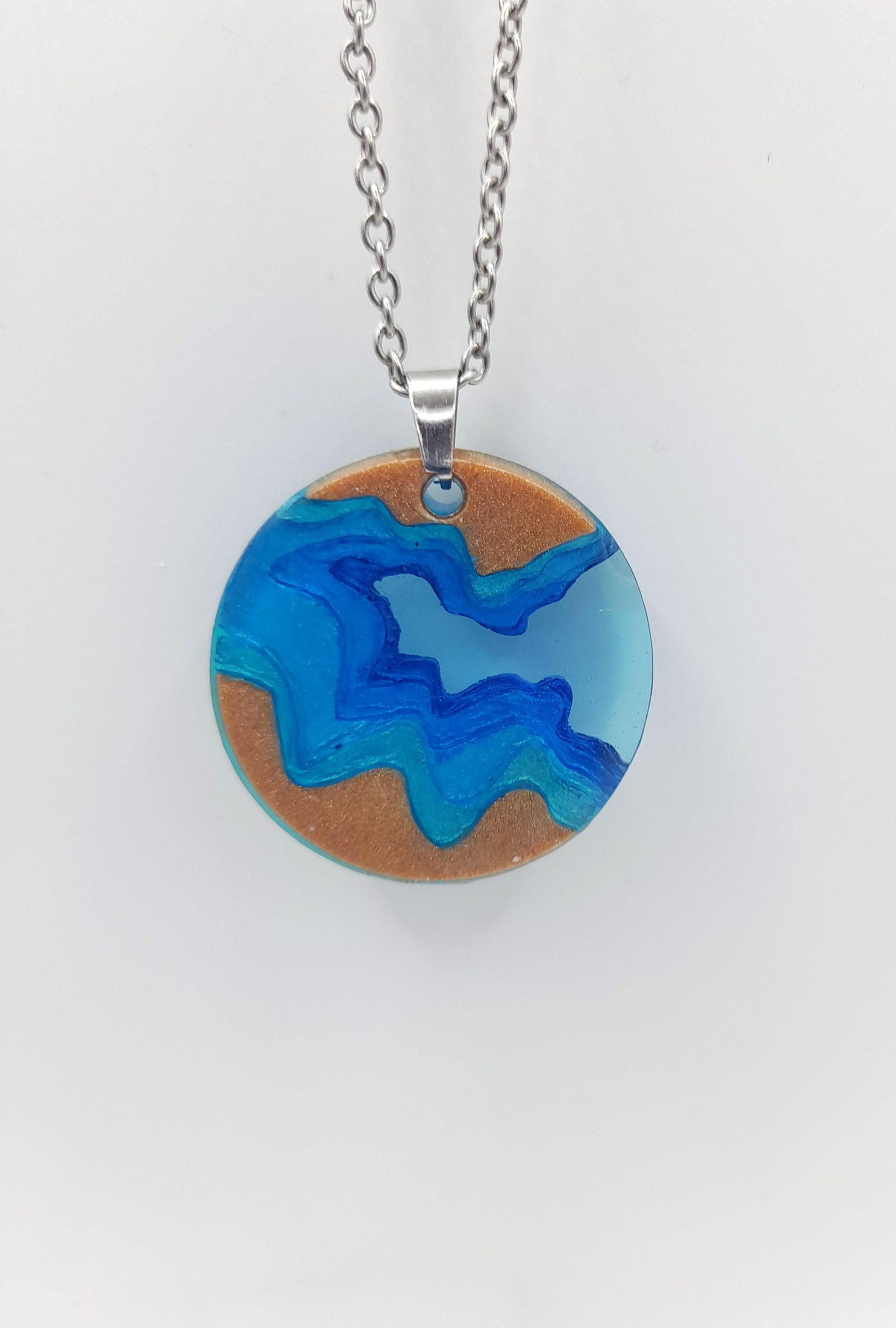 This handcrafted seascape resin pendant brings the ocean to life with its striking layered design. Four shades of blue create a sense of depth and movement, while the top layer in soft sand tones adds a beach-like finish. Each pendant is unique, with its own wave-like patterns and textures, making it a truly one-of-a-kind accessory.