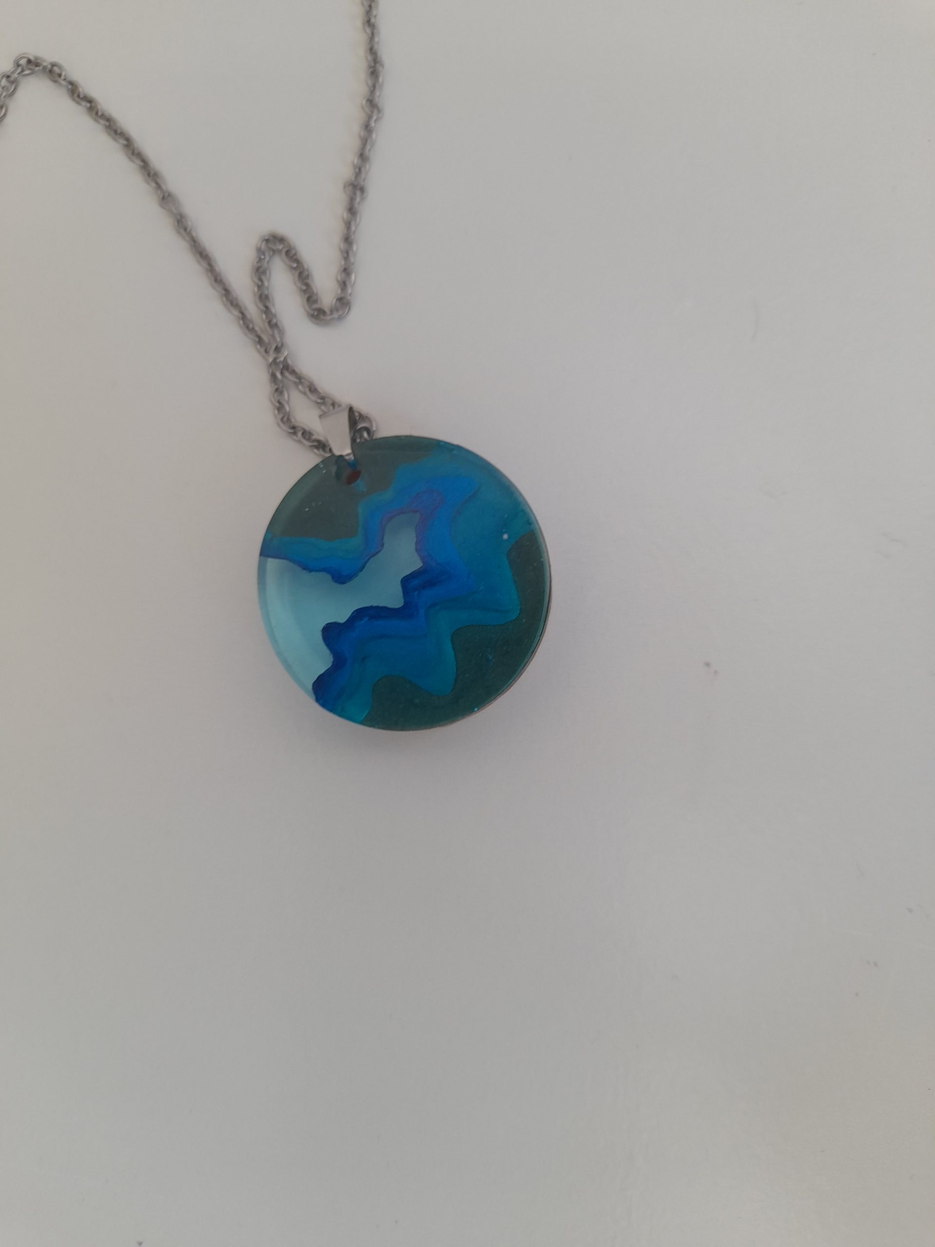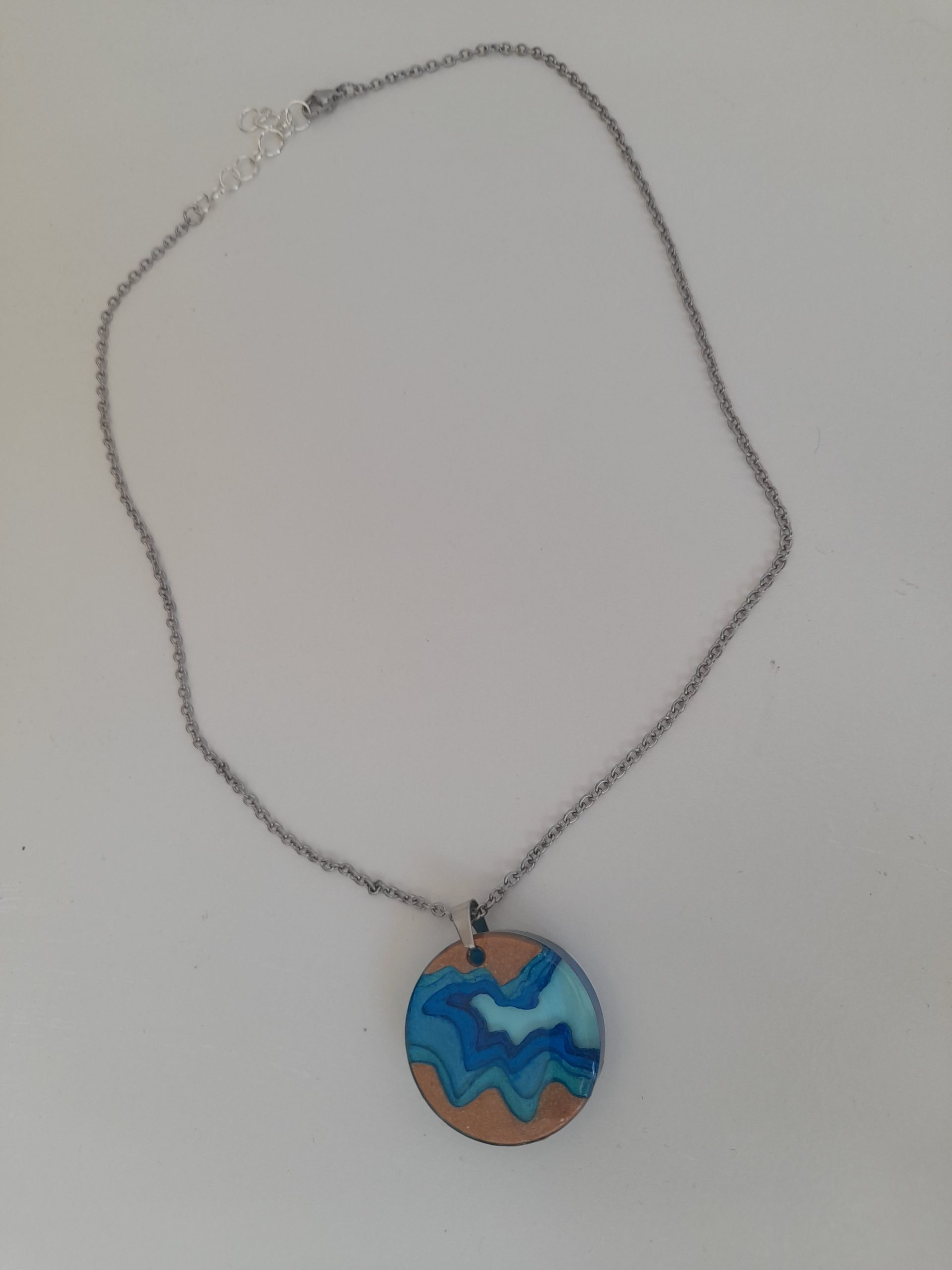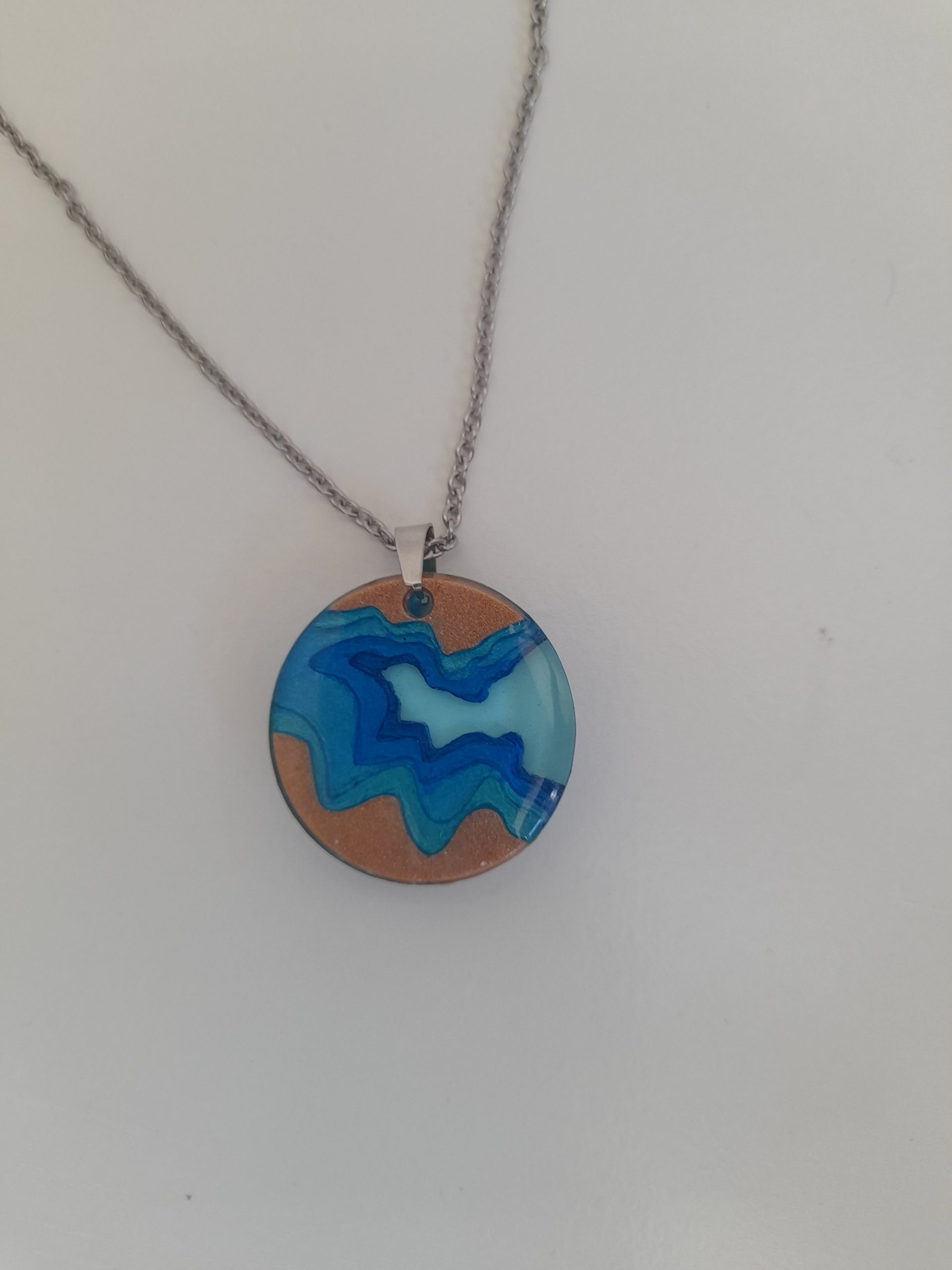 This handcrafted seascape resin pendant brings the ocean to life with its striking layered design. Four shades of blue create a sense of depth and movement, while the top layer in soft sand tones adds a beach-like finish. Each pendant is unique, with its own wave-like patterns and textures, making it a truly one-of-a-kind accessory.