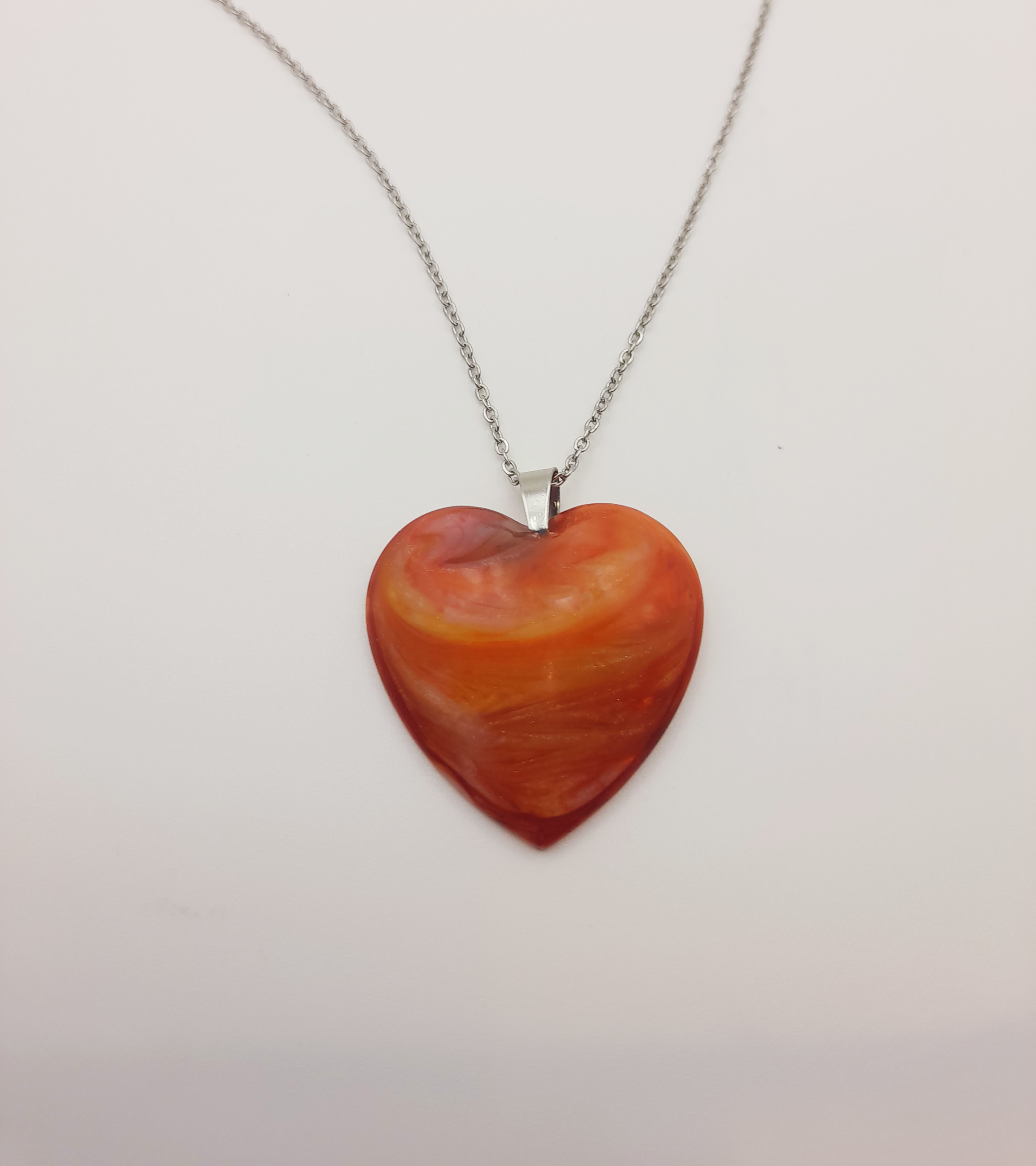 This colourful resin heart pendant features a blend of orange, yellow, red, and white shimmer, creating a warm, glowing finish. The pendant is set on a durable stainless steel necklace, making it comfortable to wear and resistant to tarnish. A bright and cheerful piece that adds a pop of colour to any outfit.