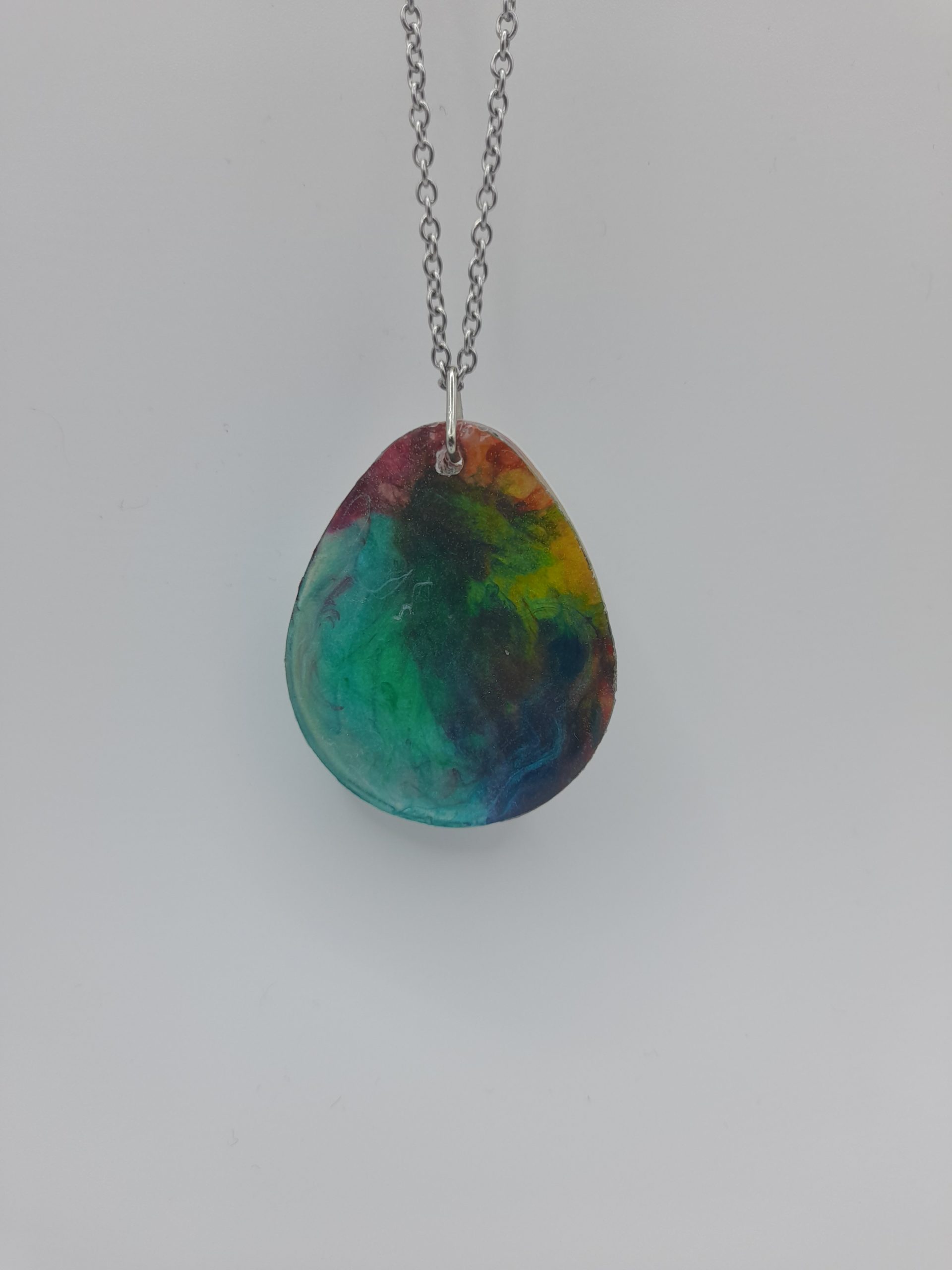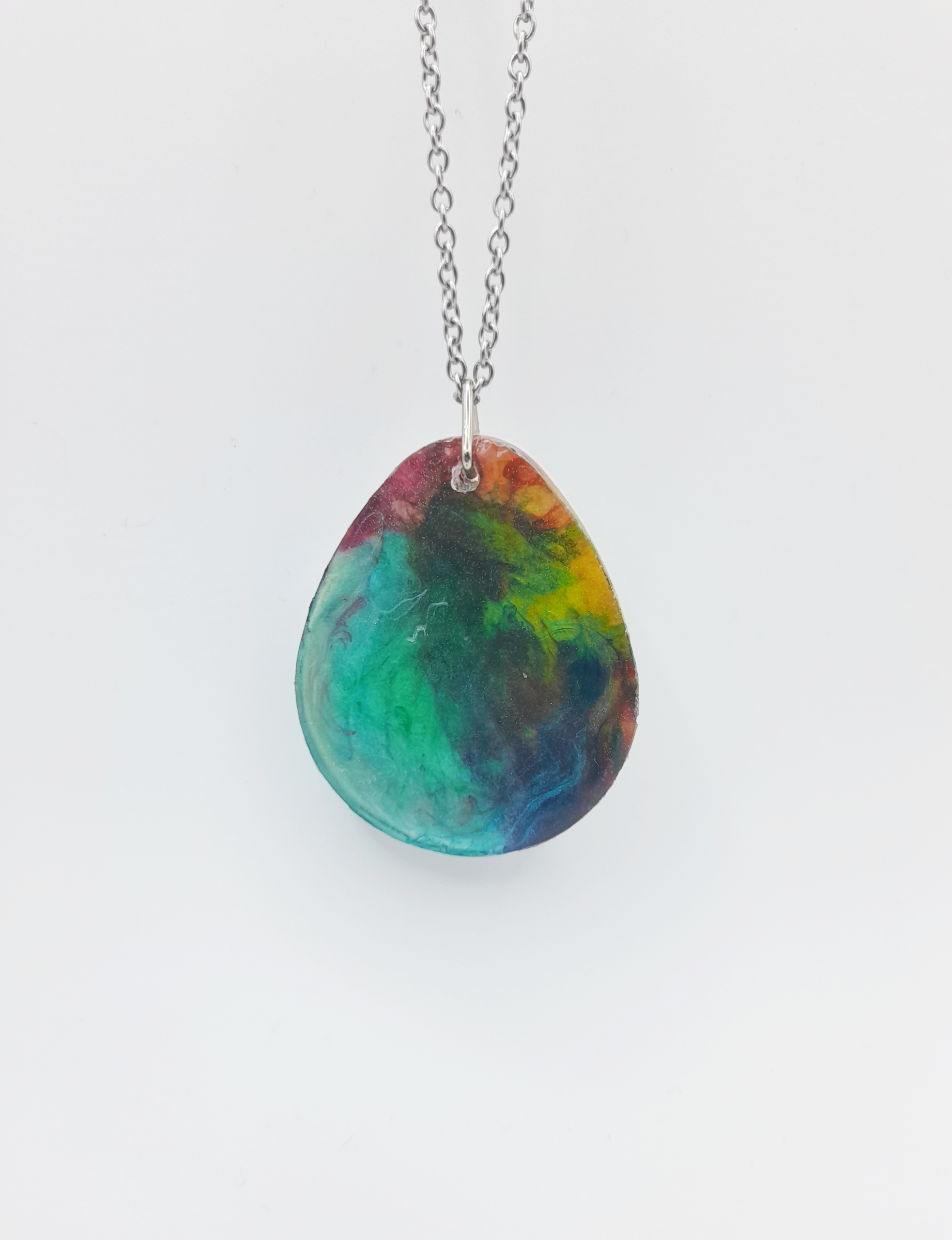 This eye-catching stainless steel necklace features a metallic multi-colour teardrop pendant that glimmers with vibrant, shifting tones. The fluid blend of colours gives the pendant a dynamic, modern look, making it a standout piece for any jewellery collection. Hung on a sleek and durable stainless steel chain, this necklace combines artistic design with everyday wearability. Perfect for adding a splash of colour and personality to any outfit.