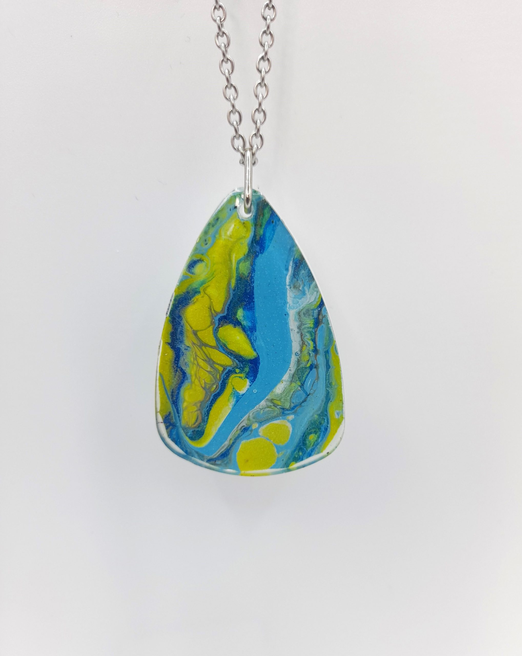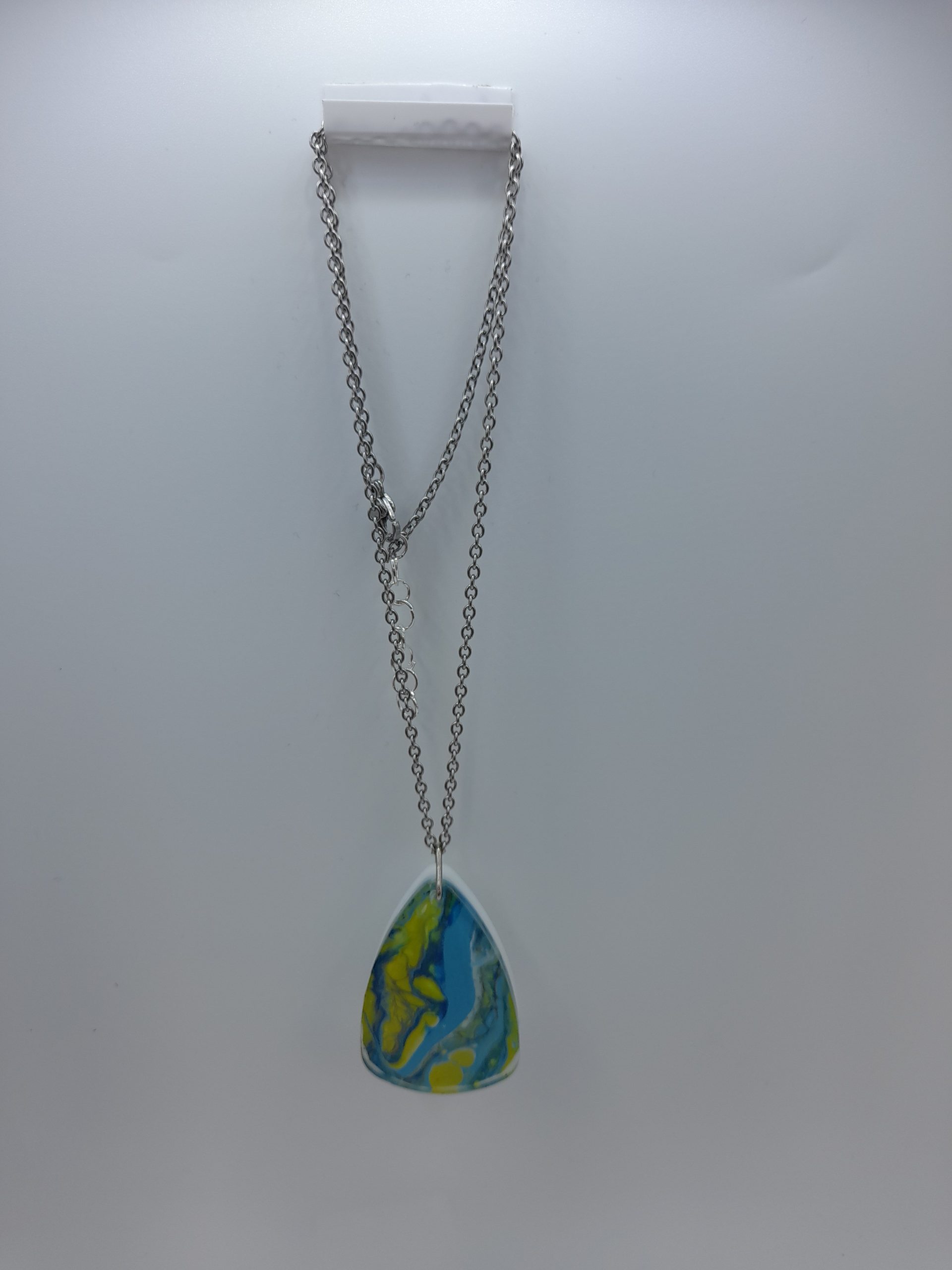 This stainless steel necklace features an eye-catching oval resin pendant with a vivid blue and yellow metallic skin pattern. The reflective finish and striking colour contrast give the piece a bold, modern feel. Perfect for adding a splash of colour to your everyday style or gifting to someone who loves unique, handcrafted jewellery.