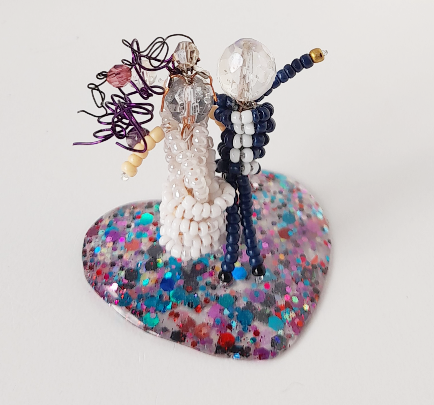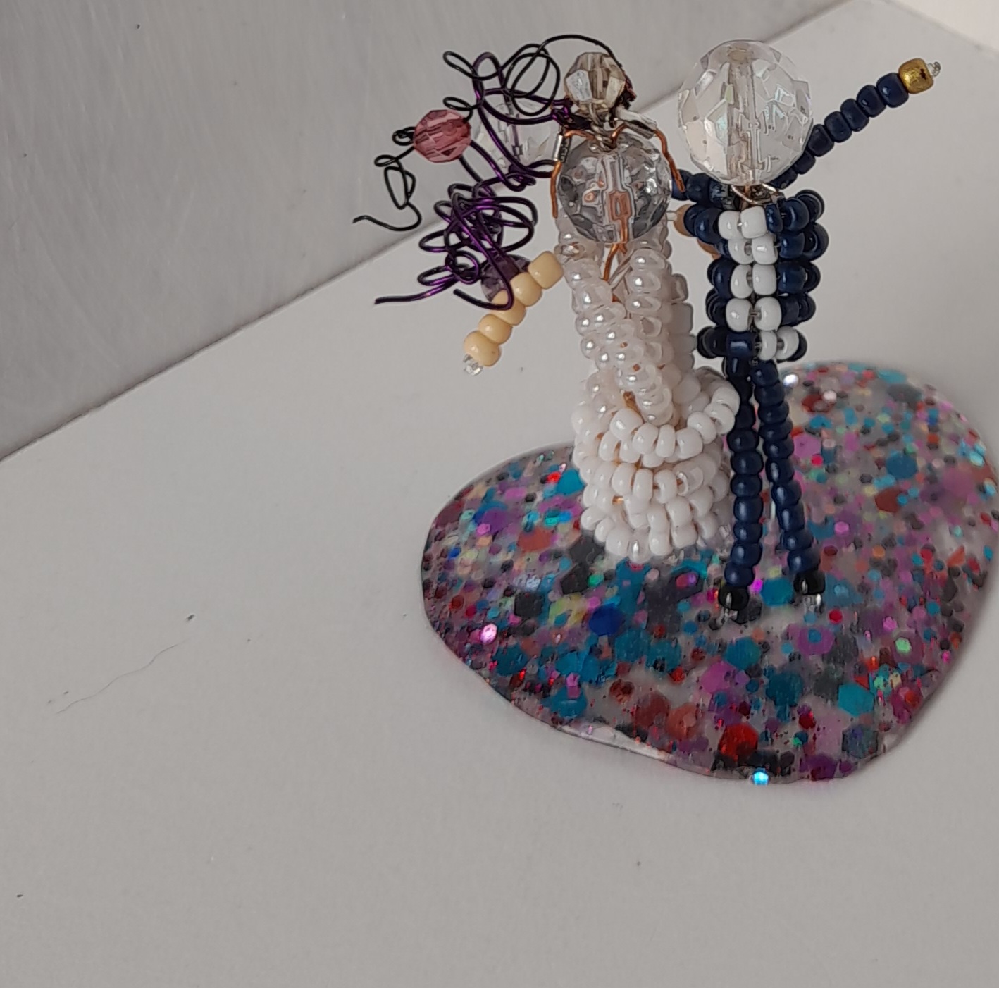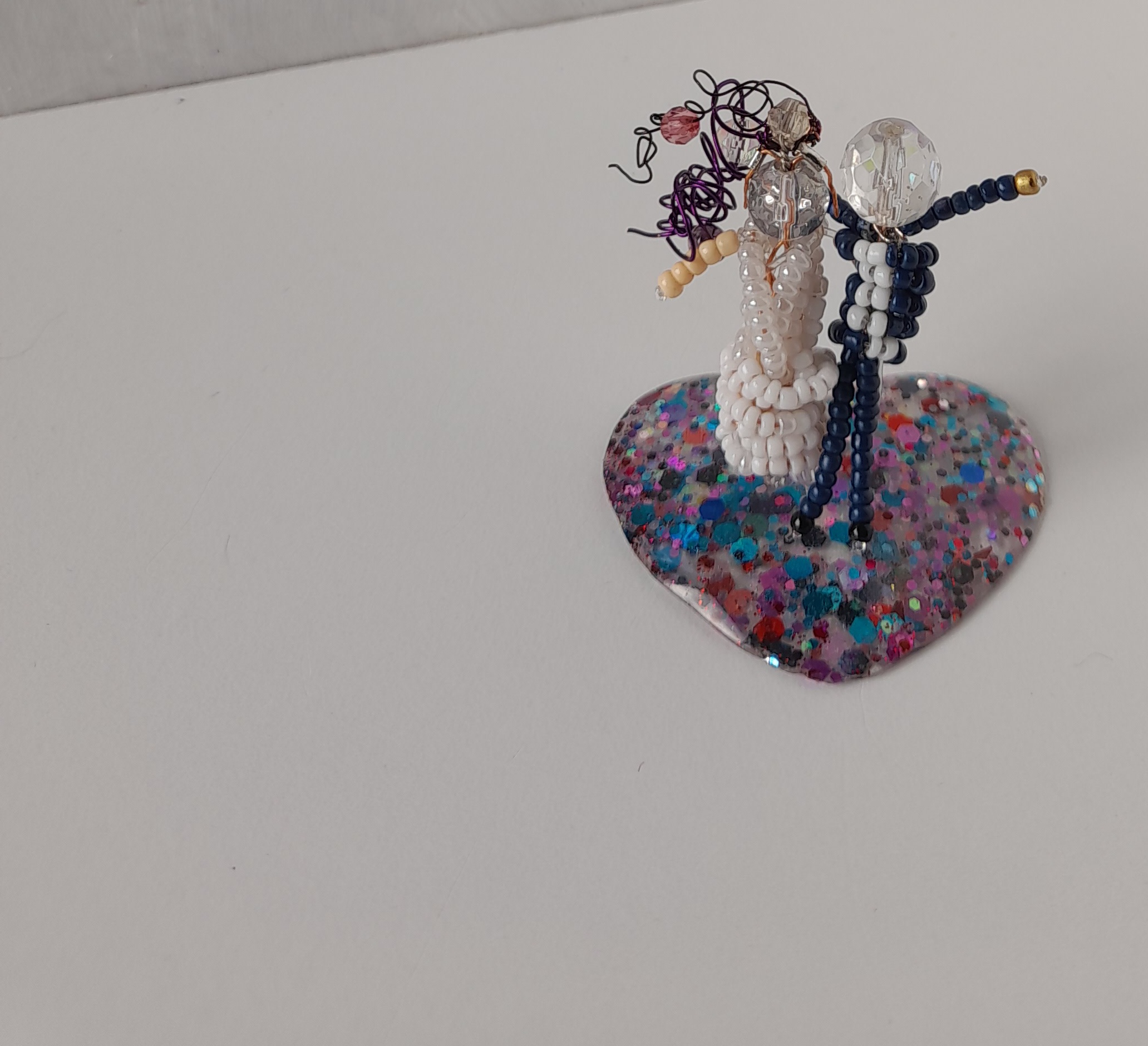 Handcrafted with precision, this charming topper features a loving couple crafted from delicate beads and crystals, nestled upon a shimmering resin glitter heart.