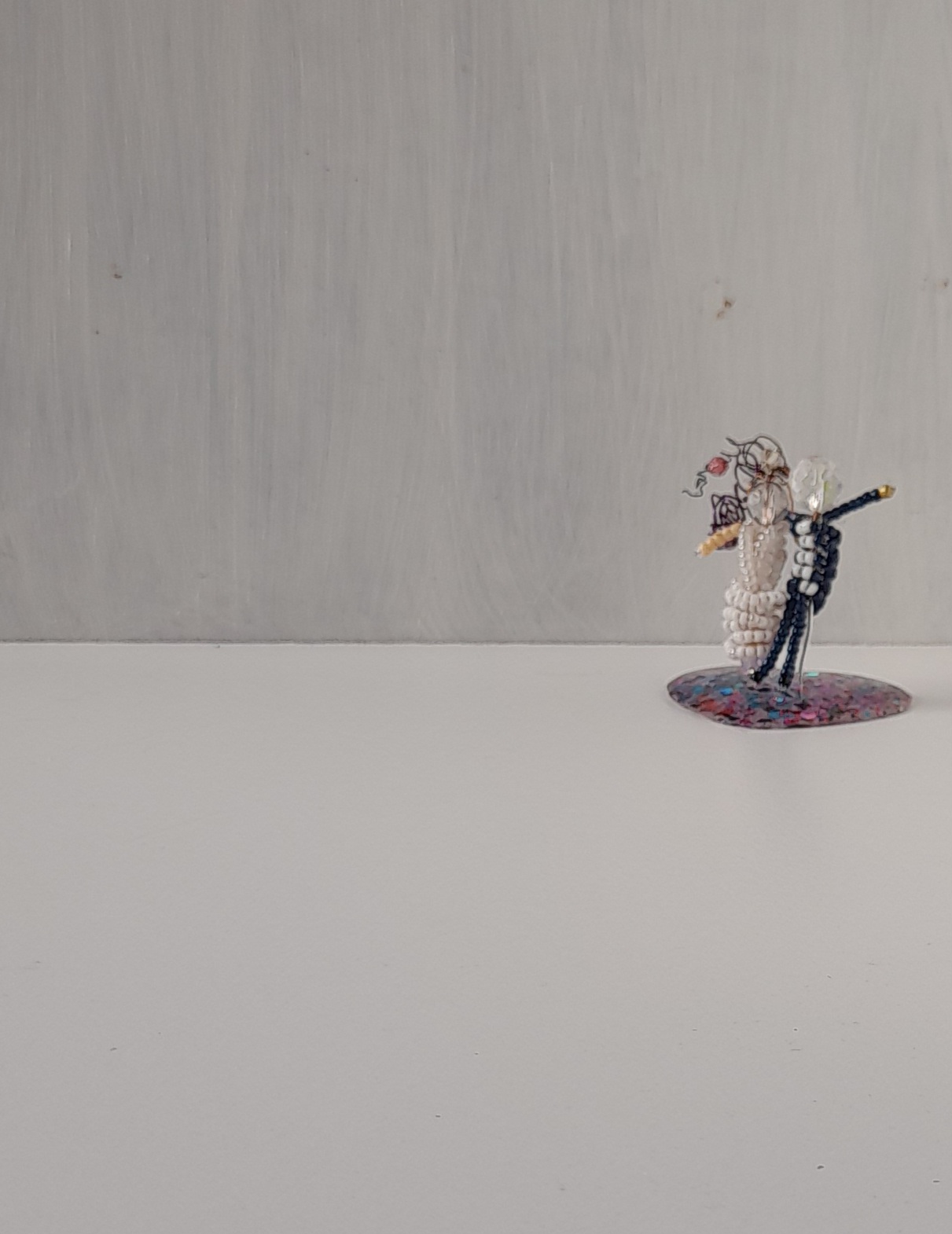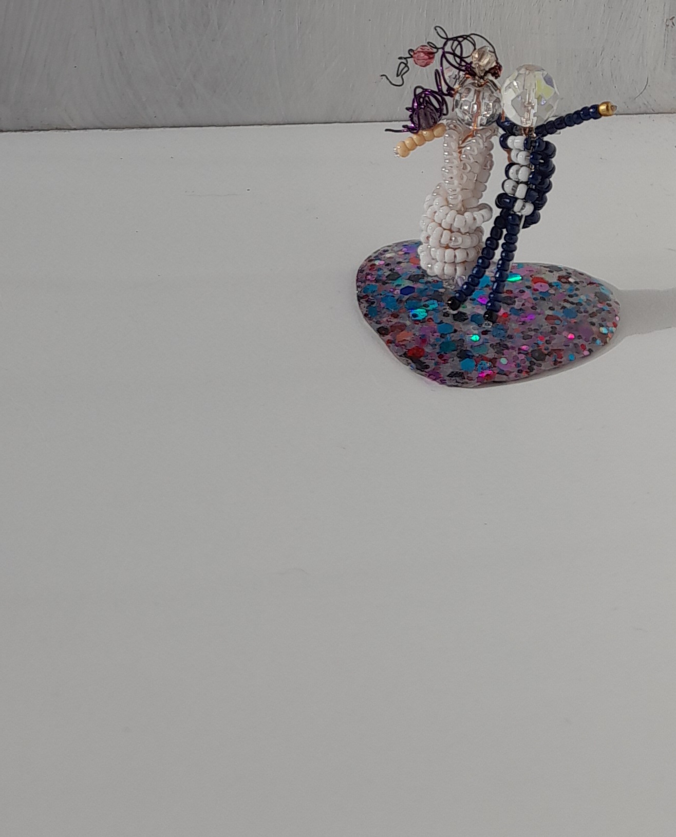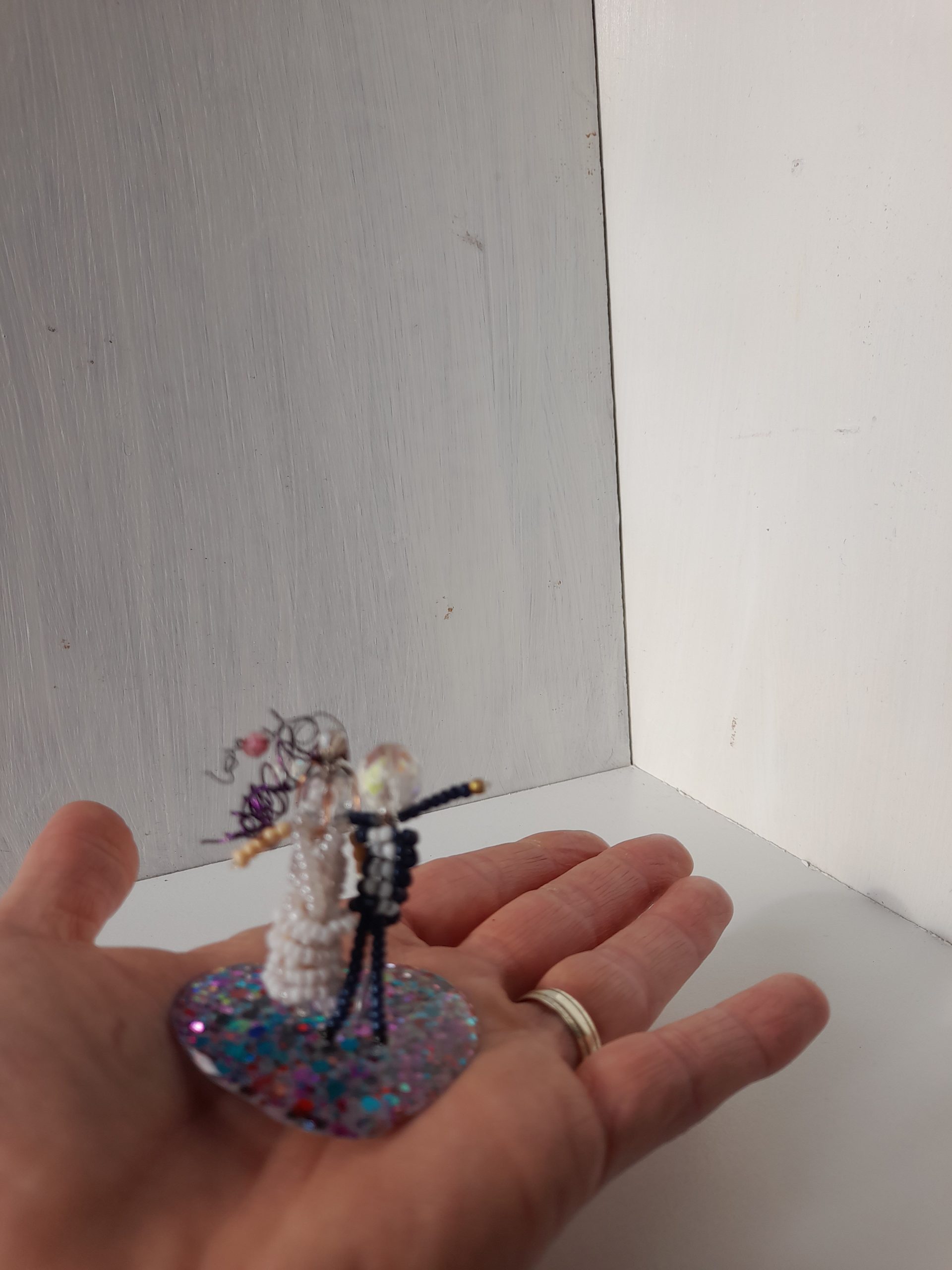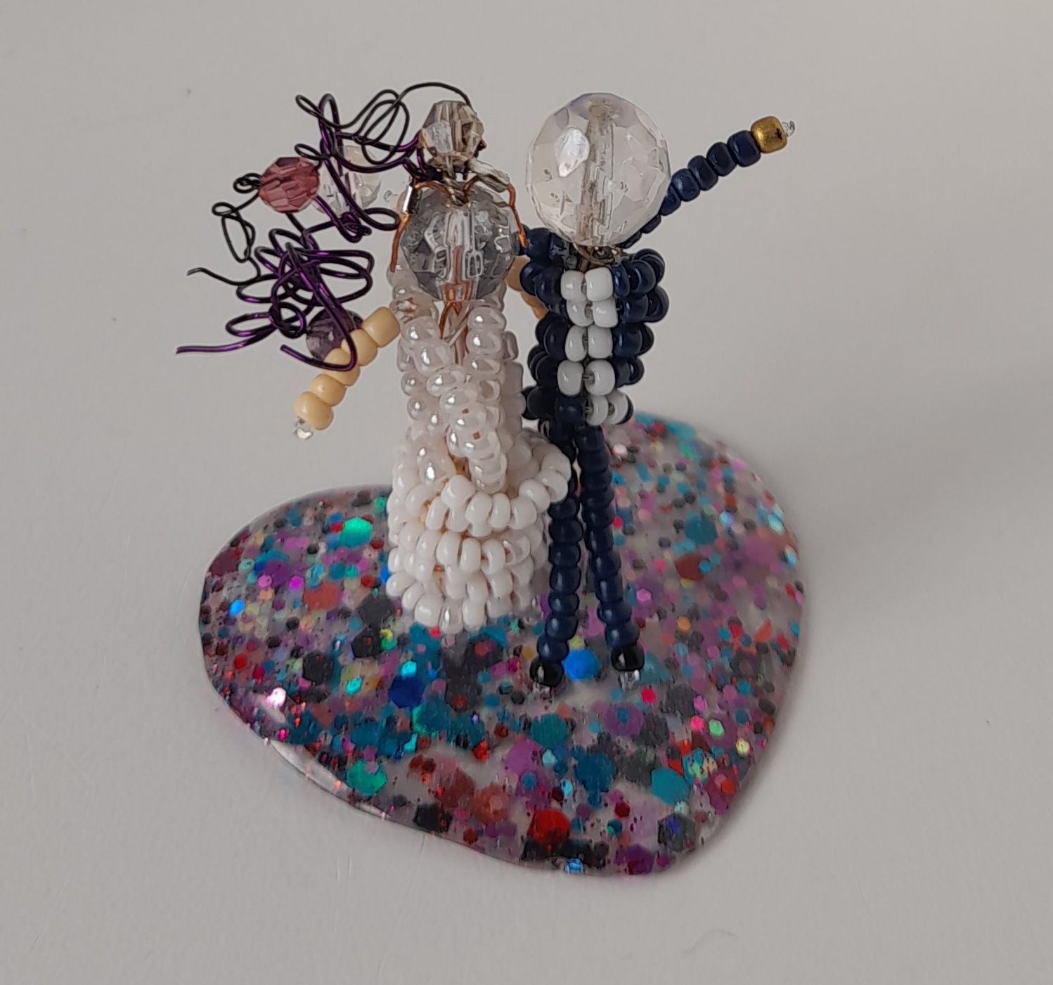 Handcrafted with precision, this charming topper features a loving couple crafted from delicate beads and crystals, nestled upon a shimmering resin glitter heart.
